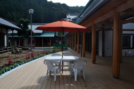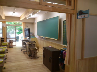 | 校長室は駅長さん。優しい校長先生が目に浮かびます。 教室の名前にも工夫がされています。小学校のイメージを変えた子どもたちの学び舎です。 また、始業前には銀河鉄道999のテーマソングが流れるそうです。 木造の校舎は木のぬくもりと香りで気持ちが落ち着きます 下の写真は1年生の教室です 裏庭にはガーデンテーブルはあちこちに配置され、子どもたちが給食などに利用するらしい |