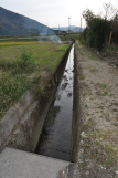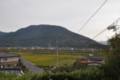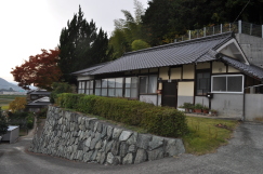 | 疎開先の家(現在) 疎開先から見えた神南山 と いつも遊んでいた小川 神南山の形は壁画とそっくりで、この前をSL(内子線)が走っていました。 |